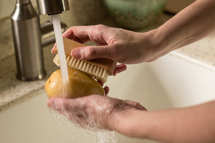 First off, wash the potatoes thoroughly. If you have a vegetable brush, go ahead and give them a good scrubbing.