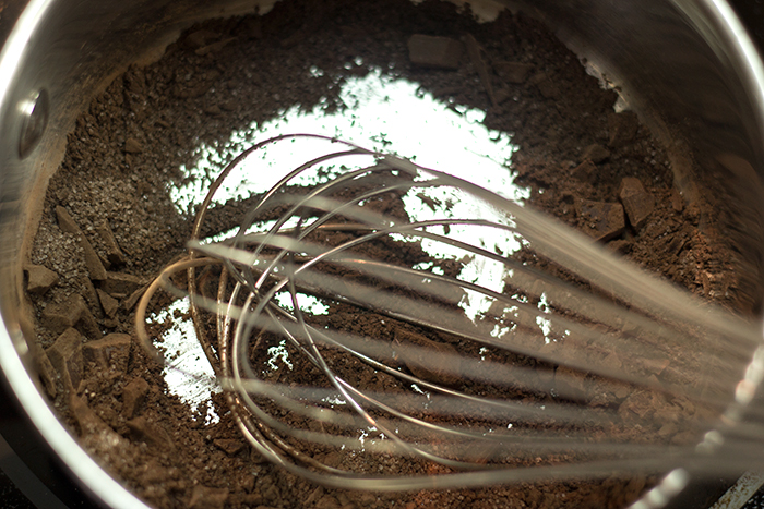 There. Dark cocoa, chopped bittersweet chocolate, vanilla sugar and a large pinch of salt all added to the pan. And yes, you really do want to add the salt as it helps bring out the flavour of the chocolate.