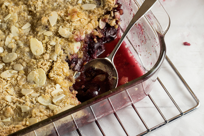 I’ve been mulling over putting this recipe on my blog for almost a year now. I started making it last summer when I happily received a surplus of Eastern Washington cherries from my Mother-in-law and needed a quick way to use up their deliciousness. Since then this cherry amaretto crumble has become one of my favourite versions of my go-to crumble recipe that I learned years ago from Southern Living. SL calls it a cobbler but technically it’s a crumble. As usual, the Kitchn can give further clarification on that, if you’re interested.